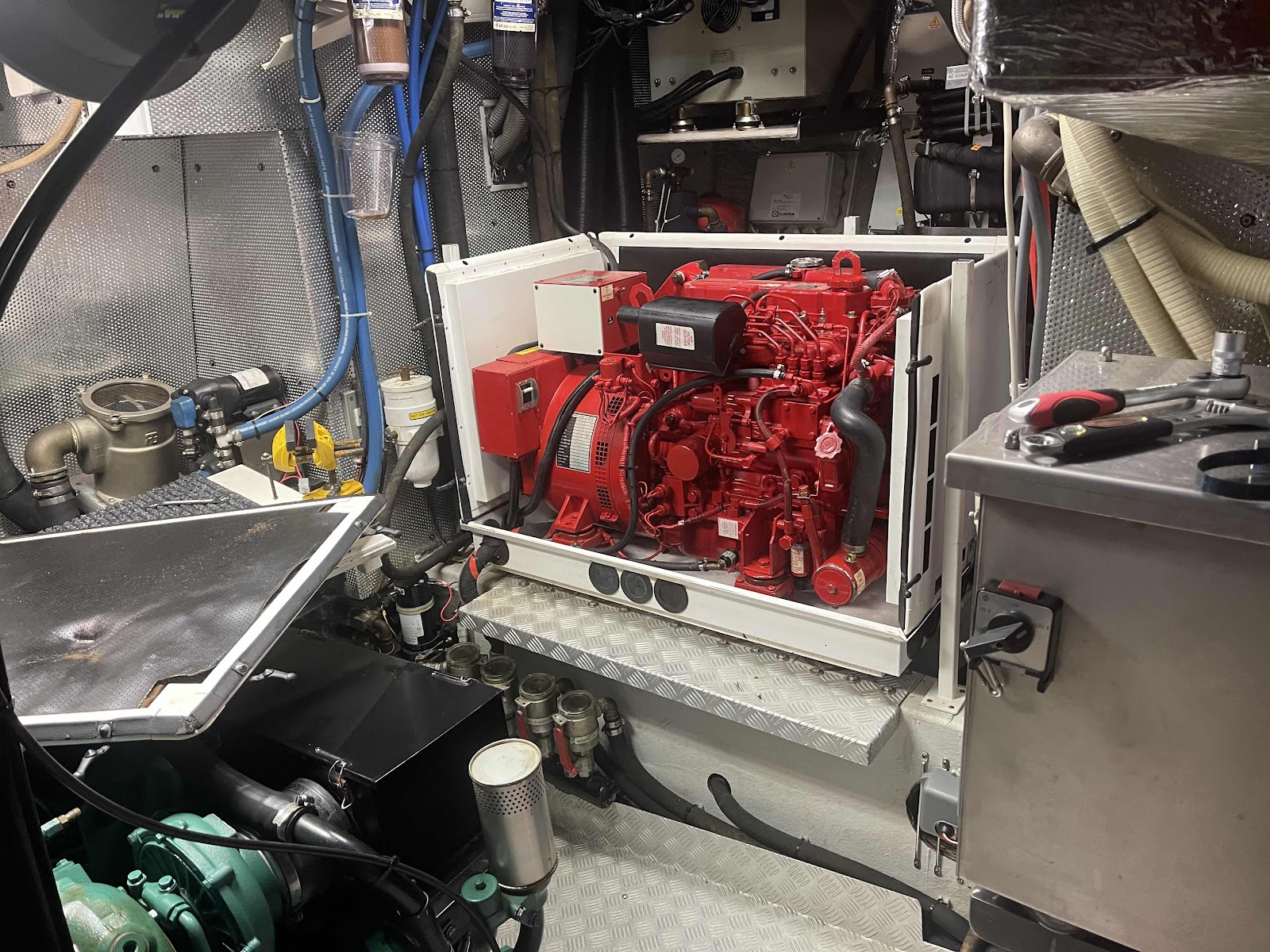 Det är en 4-cylindrig Perkins motor på 25 hk som driver en generator på 12kW. En vanlig sommar går den inte många timmar. På den här utflykten blir det fler timmar då den används när vi gör dricksvatten genom att avsalta havsvatten.