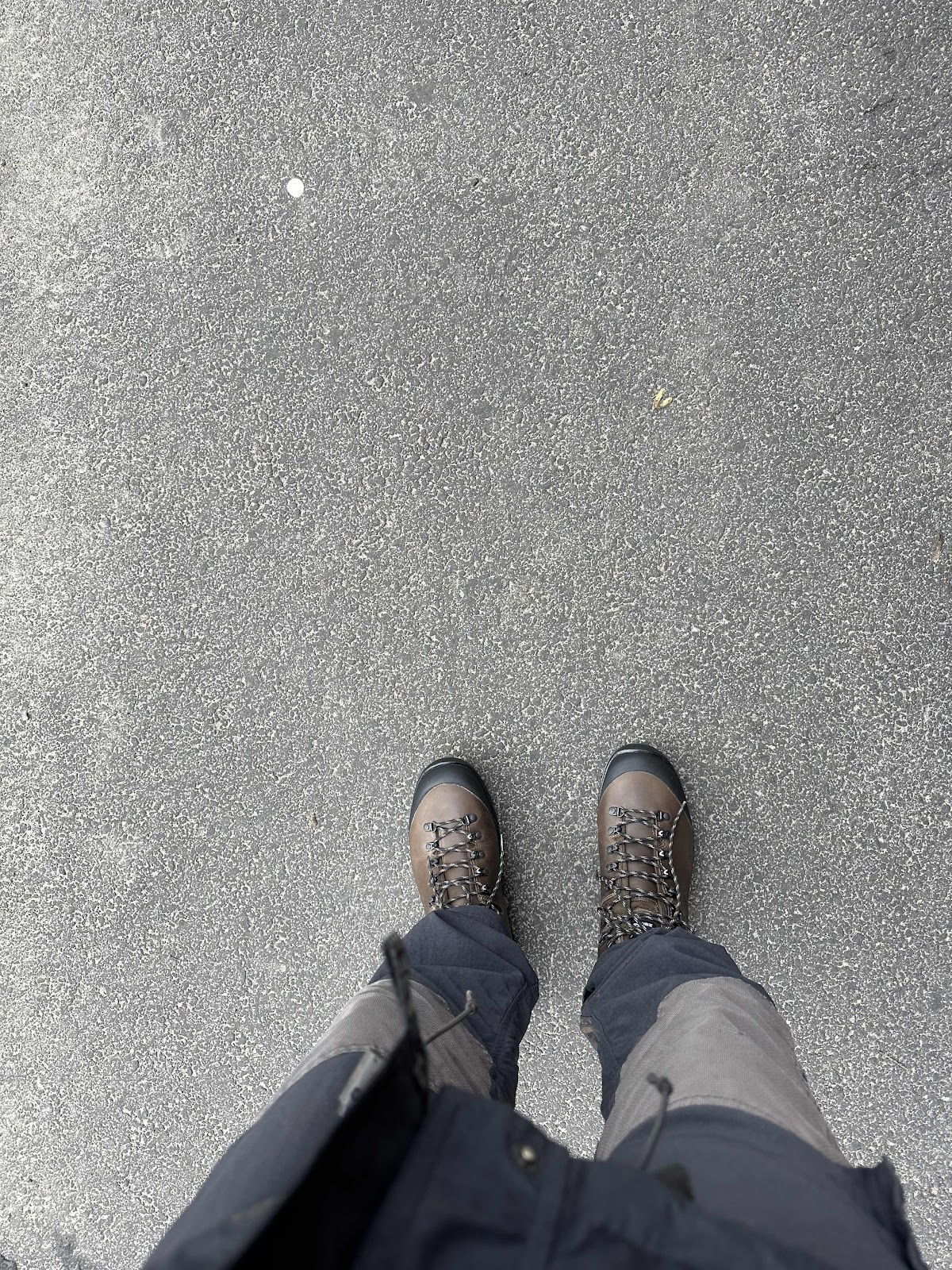 Dom nya kängorna kom inte till sin rätt i en trapp utan snarare tvärtom. Det hade varit enklare att gå barfota för slippa lyfts tunga kängor för varje steg.