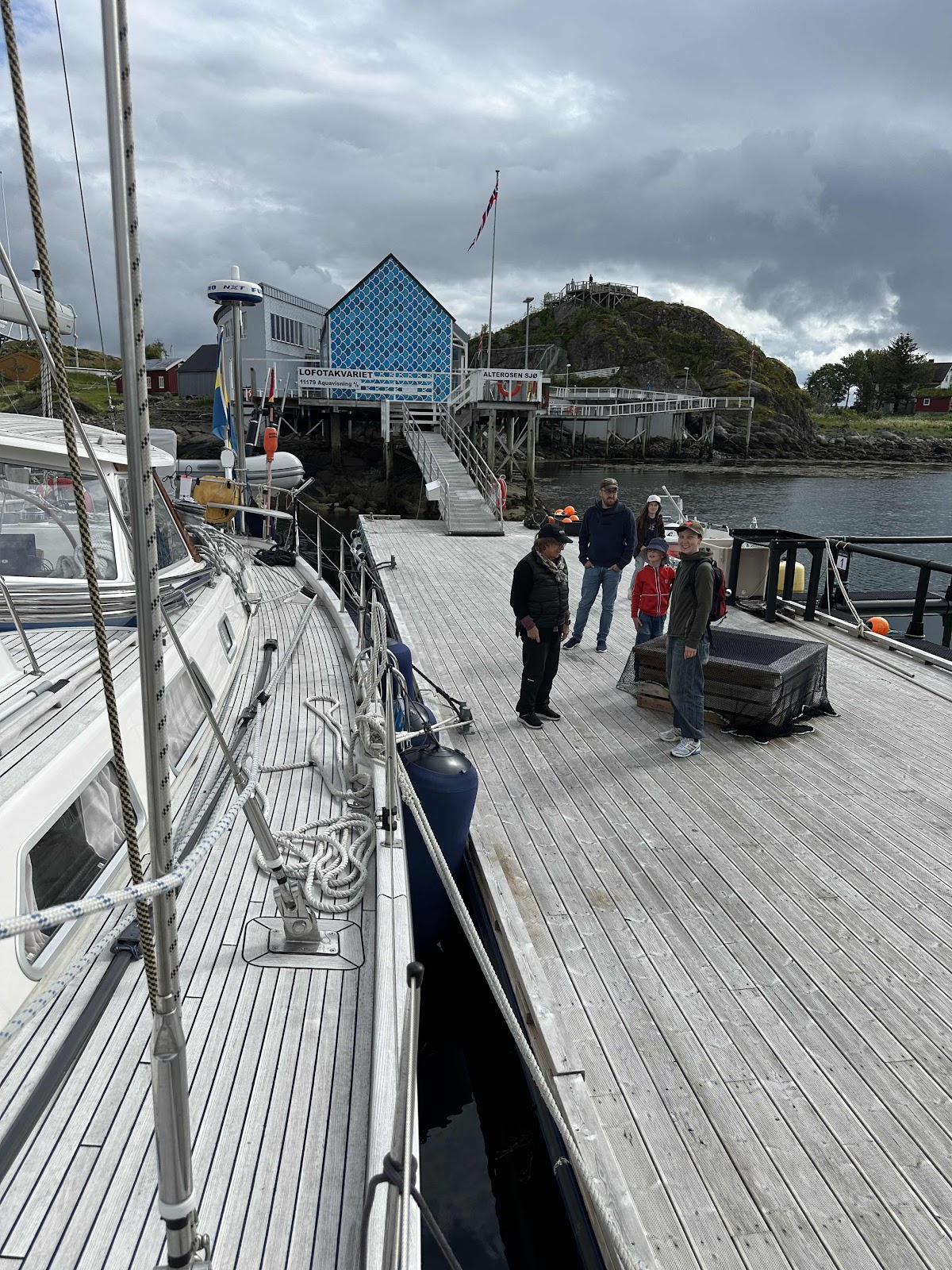 Det skulle gå att lägga till vid Lofoten Akvariet trots att det på sjökortet såg grunt ut. Men, mycket riktigt, det fanns plats på en flytbrygga som passade alldeles utmärkt för Charlotte. På andra sidan bryggan var det en liten kasse med 174 laxar som matades alldeles efter vi anlänt. Guiden påstod i alla fall det det var 174 st.